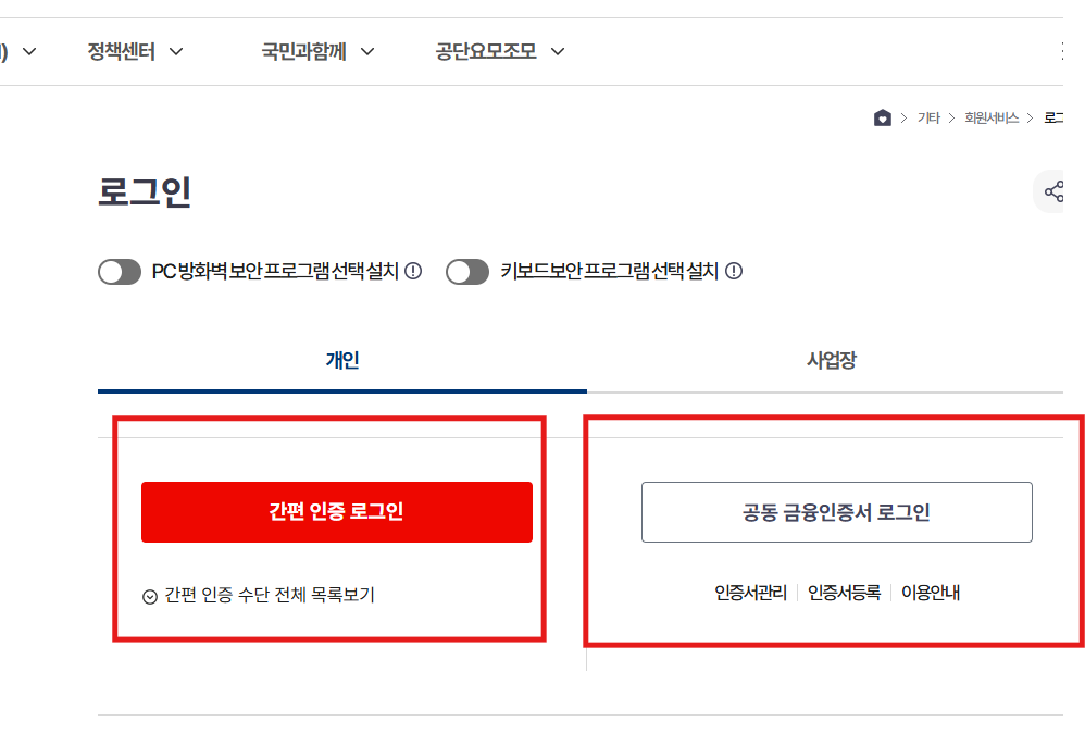 - 로그인 방식은 공동인증서(구 공인인증서), 금융인증서, 또는 간편 인증(카카오톡, 네이버, PASS) 중에서 선택 가능합니다.