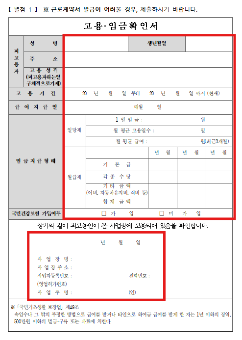 - 고용·임금 확인서 : 근로계약서 발급이 어려울 경우 제출 - 통장 사본: 본인 명의 통장