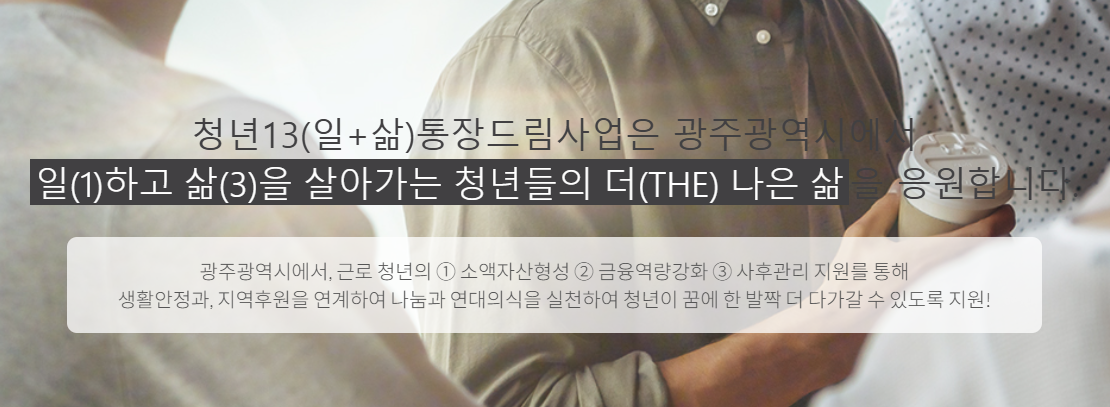 광주 청년들의 자산 형성을 위한 최고의 정책, 광주 청년13통장을 소개합니다. 본인이 월 10만 원씩 10개월 저축하면 광주광역시가 100만 원을 지원합니다.